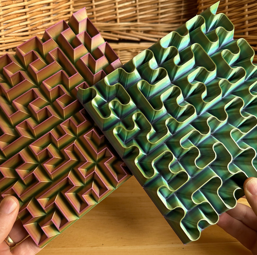 These clever geometric panels are designed to print fast and light using vase mode, saving both time and filament. Inspired by the Hilbert curve, they come in two sizes (100mm and 200mm) with mirrored versions so you can tile patterns across a whole wall.