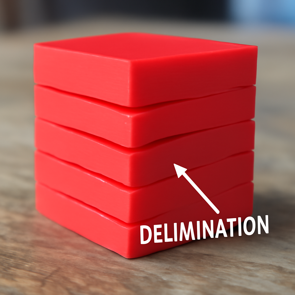 Delamination occurs when successive layers don’t properly bond. The result is visible gaps, splits, or even full detachments mid-print. It’s often caused by: