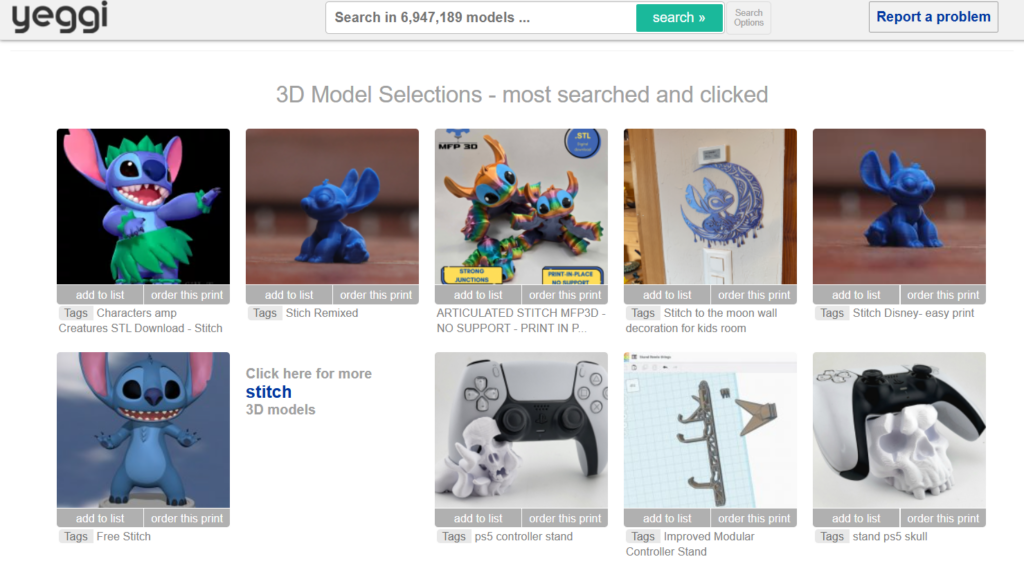 Yeggi functions as a search engine for 3D models, rather than a traditional STL repository. Instead of hosting its own files, it scans and indexes models from across dozens of other platforms—including Thingiverse, Printables, Cults, and more.